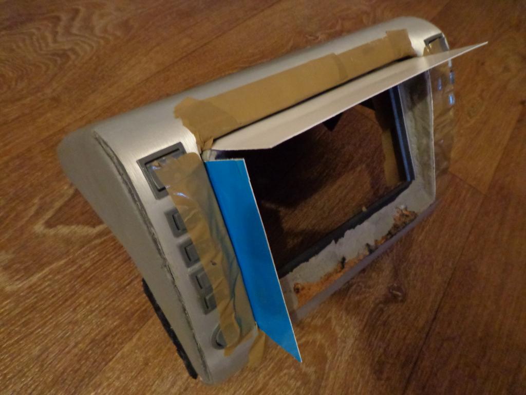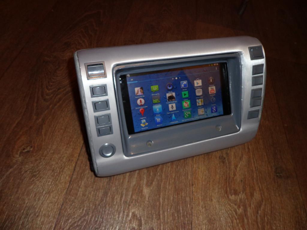 Немного текста ![]() Рассматривая вид консоли(см.предыдущие картинки),всё время возникало чувство незавершённости..Этот ворсистый карпет,эти кнопки...хоть вид был приемлем,но всё же решил дорабатывать,появились идеи: -покрасить кнопки в тёмно-серый цвет,под цвет салона -сделать рамку -сделать планшет не снимаемым... Кнопки были покрашены,далее началась эпопея с рамкой...Как-то три года назад мне подарили автомобильный телевизор,который был ужасно толстый имел небольшое разрешение экрана..Но вот сам корпус телека,а именно рамочка очень хорошо подходили под длину\ширину экрана планшета. Решено было резать ![]() Далее последовал эпоксилин.. Рамка была сделана,зашкурина,загрунтована и покрашена Далее решено было вывести кнопки планшета(включение, увеличение и уменьшение громкости -на кнопки консоли) Вскрыл планшет припаял провода,собрал... От этих торчащих проводов было фигово...Думал-думал и решение было найдено,точнее оно уже давно было.У меня же есть классный разъём,который я вывел в корпусе!В общем отпаял эти провода нафиг.И вывел:питание планшета,кнопку включение\уменьшение\уменьшение громкости\av-out и микрофон с общей землёй.. Так же сделал теперь уже нормальный разъём для подключения к кнопкам Собственно говоря все три кнопки работают! Стабилизатор напряжения,так же "облагородил" Собственно говоря вот что вышло Т.к. в планшете убрал кнопку питания,а вынимать для перепрошивки и т.п. его всё изредка будет нужно,то просто вывел кнопку питания сзади) Конечно дорабатывать ещё нужно: рамку и кнопки подровнять,подклеить плёнку установить это всё же в машину. ![]()