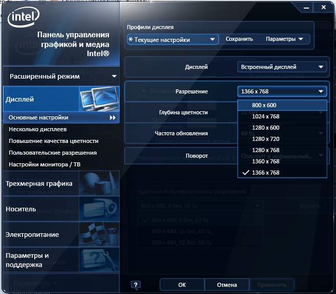 В утилите IntelGrafics можно создать пользовательское разрешение, оно добавляется в список пользовательский разрешений, но в обычный список разрешений это разрешение не попадает. Соответственно и переключиться в это разрешение не выходит.