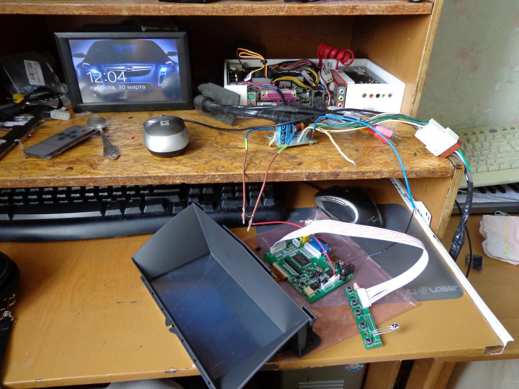 Штатный монитор переедет на потолок, а на его место встанет штатная рамка 6.5" с такой же матрицей, можно было переделать под 7" ,но что то мне не нравился результат у всех кто это делал! Системник будет в багажнике, с акб пойдут два + провода КГ16 на каждый усилитель ,от них же будет питаться и ПК . От системника вперед пойдут VGA 5 метров, три usb и питание монитора с АСС