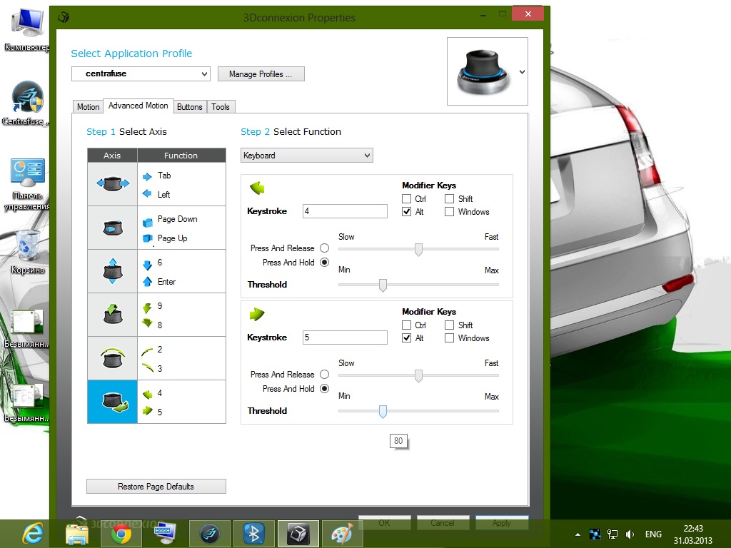 На первой вкладке, называемой "Motion" бегунок стоит на значении 1,0 и этот показатель влияет на скорость передвижения курсора по экрану в режиме 2D а в режиме 3D на скорость вращения фигуры. В режиме назначения горячих клавиш с клавиатуры значение данного бегунка ни на что не влияет. Значит у тебя что-то криво встала программа или драйвера. Советую переустановить отсюда http://www.3dconnexion.com/supported...5-505cd89d7718