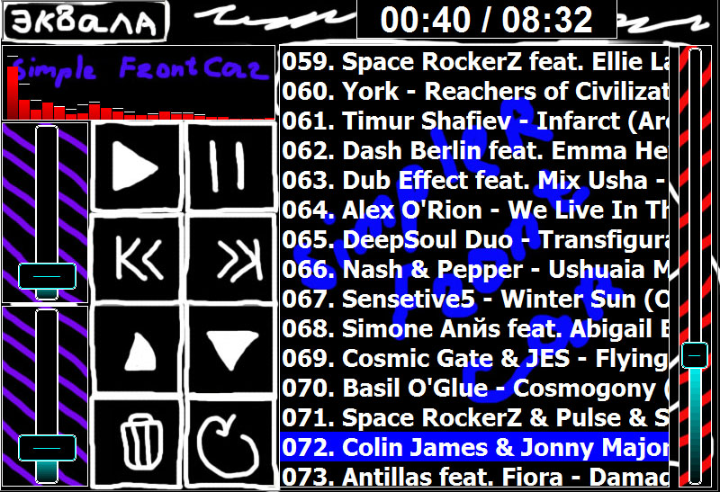 Теперь осталась только кнопка «Эквалайзер», + эта кнопка и время проигрывания могут располагаться по всей форме плеера 2. Новые полосы прокрутки с бОльшими возможностями описание в следующем посту 3. возможность нарисовать свой фон с кнопками, сами кнопки невидимые, также фон для плейлиста, бегунков и панели визуализации