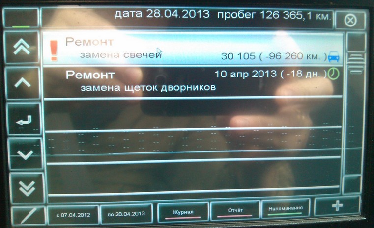 Установливаю напоминание, например, на замену свечей. Периодичность 30000 км. Выставлюю существующее показание спидометра. Напоминание выскакивает через несколько километров пробега. ![]() |