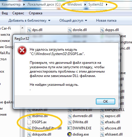 В командной строке запущеной по админом вставляем строчку и жмем на ентер (придварительно нужно туда скинуть DSGPS.ax)
