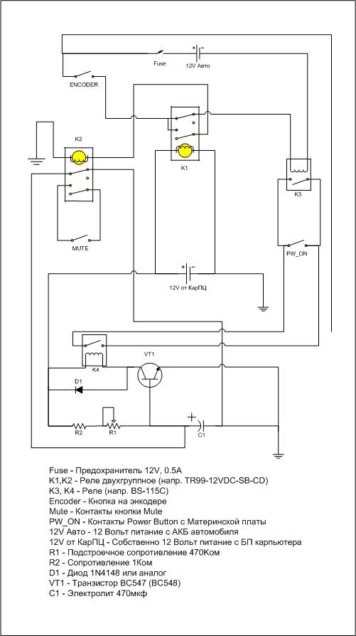 Мелкосхемки такие: inv - шесть инверторов в одном корпусе (Y-=NOT(A)), and - счетверенный модуль "И" (Y = A and B), 556 - два таймера 555 в одном корпусе. Все микрухи реальные, продаются в чипдипе за копейки, даташиты на них есть там же. Ссылки выложу вечерком из дома, сейчас не найду просто. Еще думаю сюда нужно будет приделать мелкосхемку 4066 (счетверенный свич) для замыкания кнопок mute и pw_on при подаче единицы на вход. Либо какие-нить оптопары. Еще примечание по логической схеме: квадратик "форм. имп." - это блок формирования кратковременного нулевого испульса в момент нажатия кнопки энкодера - нужно для правильной работы таймеров. Вчера еще забыл огласить фичи: 1. Компутер выключен. 1.1. Нажатие энкодера - ничего не происходит, потому как схема не запитана (подразумевается что берем +5v с БП). Нужно доработать. Кстати ежели схему запитать напрямую от борта через стабилизатор - то все будет работать красиво и без лишних реле. 2. Компутер включен. 2.2. Нажатие энкодера - ничего не происходит (только в недрах схемы запускаются 2 таймера - короткий и длинный, скажем 0,5 и 4 сек. Интервалы таймеров можно установить любые, независимо друг от друга). 2.3. Энкодер отпущен. Если кнопка отпущена до истечения короткого таймера, то срабатывает mute. Если в период между истечением короткого и длинного - то ничего не происходит. 2.4. Энкодер удерживается нажатым после истечения длинного таймера - замыкаются контакты pw_on и остаются замкнутыми до отпускания энкодера либо до выключения питания на схеме. Таким образом, главное отличие от Пашиной системы - Мут замыкается только при отпускании кнопки не позднее чем период короткого таймера. Таким образом, если кнопка удерживается длительное время, то Мут не замыкается, а отрабатывается выключение компьютера. В итоге все стоит дешевле и не щелкает. ) В общем если есть желание повозиться подольше чем с релюшками, зато все сделать красиво и правильно, то могу попробовать печатку под это дело отрисовать. Под поверхностный монтаж. P.S. Люди добрые, проверьте схему, а? ))