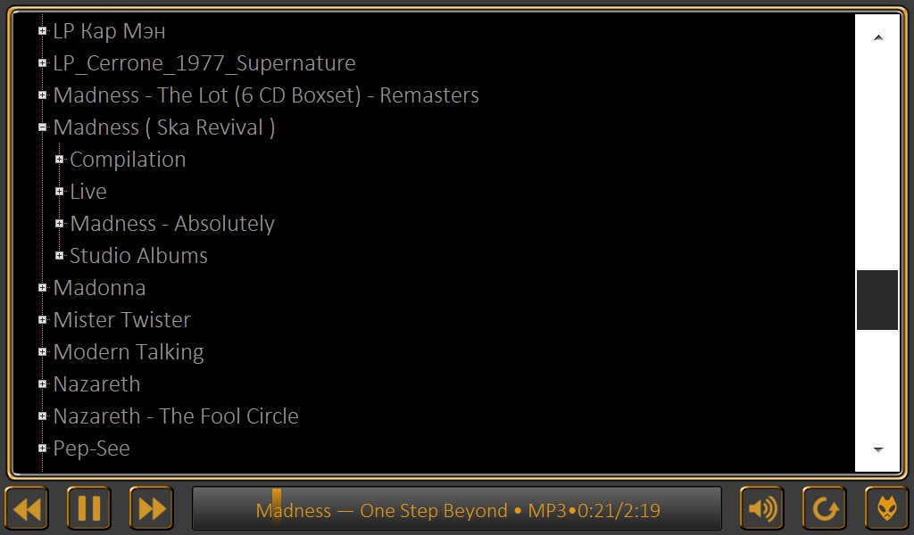 Подскажите, как в изображённом интерфейсе Фубара сделать следующие изменения: -Есть ли способ сделать кнопки и скролл-бары раза этак в два больше? -Вертикальный скролл в плэй-листе очень узкий, можно ли сделать так, чтобы тянуть список можно было не только за узкий скролл, а ещё и за пустое поле в списке в любой точке? Ещё технический вопрос, может кто знает: раз-через-два при загрузке компьютера, музыка в фубаре запускается с хрипами (подключение произведено по оптике, через pci звуковую карту)