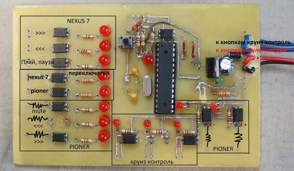 Для начало о машине: Lacetti 2011 года, установил в него планшет Nexus7 и заодно оставил магнитолу den9300sd, сам блок магнитолы утопил за торпедой а откидную панельку установил на потолок (соответственно купив 20-и жильный 3-х метровый шлейф 80 рублей за метр) Потом приобрел родные рулевые кнопки на руль, для управления круиз контролем и мультимедиа (круиз контроль самодельный хочешь себе иди сюда) С самого начало думал что рулевые кнопки будут управлять только pionerom но со временем захотелось сделать так чтобы рулевыми кнопками можно было управлять и Pionerom и Nexusom. В итоге собрал такую вот плату на Atmega328 (я понимаю что она мощная для таких целей, но что было под рукой тем и делал) прошивка написана в среде ARDUINO, там всё довольно таки просто), она управляет и пионером и нексусом, резисторы для пионера пока не установлены (нет в наличии нужных номиналов=(( ) но по USB работает отлично, для управления планшетом решил использовать обыкновенную клавиатуру, (перепаивать клавиатуру очень просто, там обыкновенная матричная клава, находим нужную кнопки и идем по дорожке к какому контакту на плате она выйдет и второй конец также, потом просто их замыкаем и проверяем, таким образом ищем нужную пару) у меня например : R5 ->C15 =следующая песня R6 ->C15 =Предыдущая песня R4 ->C14 =плей, пауза управляется всё это дело так: на мультимедиа кнопках, когда удерживаем кнопку моде она переключает управление на nexus7 ещё раз удерживаем переключает на pioner и так по кругу, если нажимаем Mode кратковременно если стоит на nexus7 то плей пауза если на pioner то муте, далее кнопка PWR следующая песня SEEK предыдущая (работает в зависимости от такого какое устройство выбрано), кнопки громкости работают только на пионер, не стал их делать отдельно для нексус так как нексус подключен к пионер через аукс, Видеоролик работоспособности платы Последний раз редактировалось Alekssandr; 12.09.2013 в 14:25. |