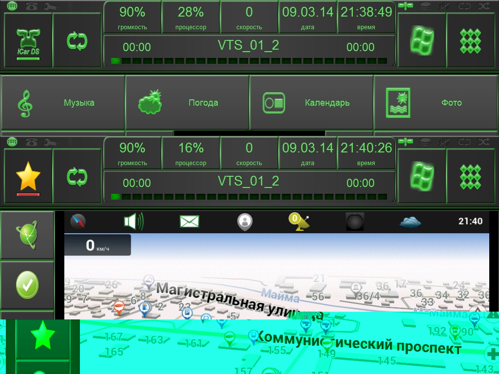 Встроенные проги сверху вниз (иконки слевой стороны скрина): навител (иконка родная), стрелка, viber, Zelo рация (в дороге развлекает)