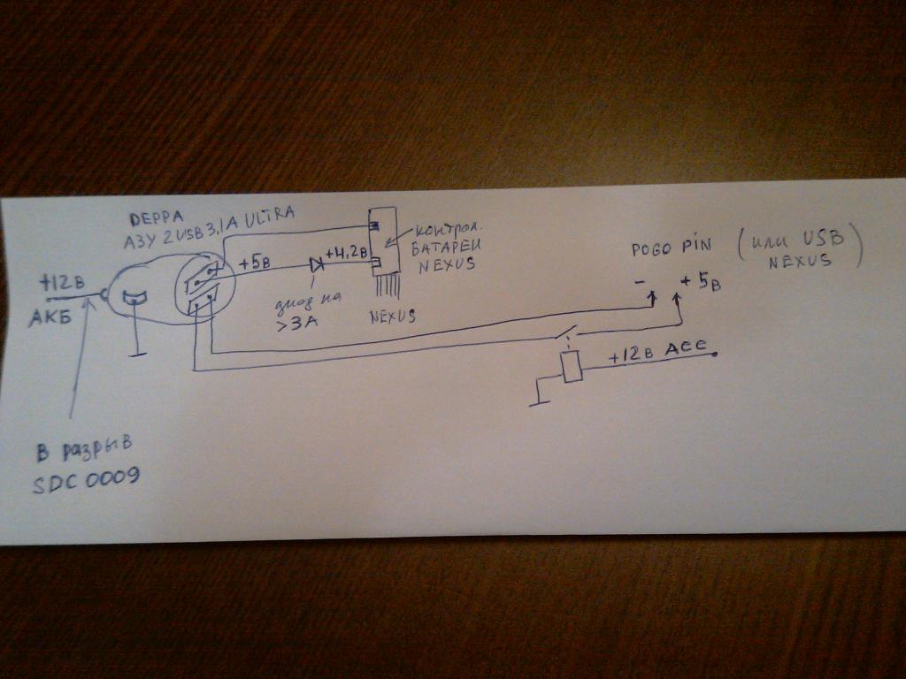 Комплектующие (пользуйтесь поиск google): deppa азу 2 usb 3,1А ultra (или аналог) реле автомобильное 5 контактов (или аналог) диод рассчитанный на ток более 3А по желанию контролер разряда АКБ SDC0009 (или аналог) родную батарейку nexus можно оставить можно и удалить (у себя я удалил) Немного описания: затычка в прикуриватель имеет два юсб выхода и может двумя выходами выдавать 3,1 А. С одного выхода +5 подаем на +контролера батареи nexus через диод, который просадит напряжение до 4,3В, со второго выхода через реле подаем на юсб nexusa или на погопин (так нексус поймет что зажигание включено пора просыпаться) управляющую цепь реле подключаем к зажиганию (зажигание вкл сразу контакты реле замкнулись в юсб нексуса пришло напряжение 5в со второго разъема затычки) Прошу не пинать:"ничего нового не написал итд итп" отвечу: скученной инфы нет, все разрознено. поэтому и написал. (схему приложил) p.s. + Дальше нужно будет настроить программу управления AutomateIt или аналог (настраиваем:1. зарядка выкл *выключить все соединения жпс вифи экран и все все все что кушает батарейку. 2. зарядка вкл * все включить...) |