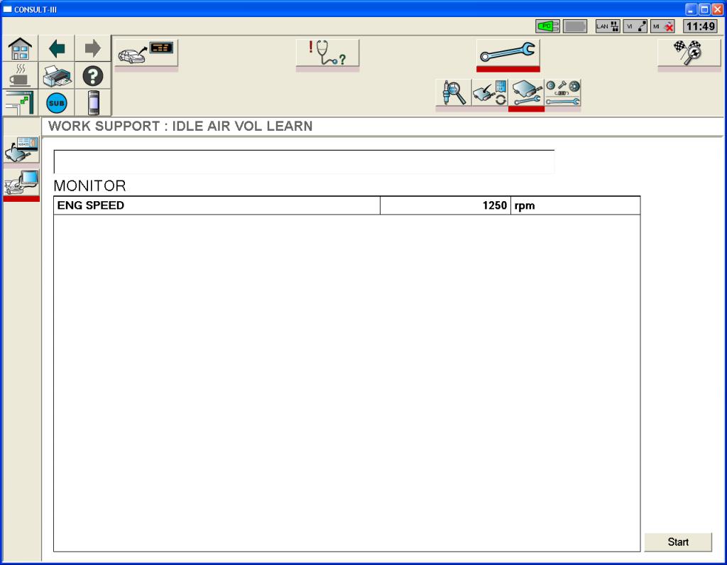 Первоначально программа показывает текущие обороты. После нажатия кнопки "start" идут сами команды обучения. При этом текущие обороты ДВС уже не идут от ECU. Consult-III, также как и TECU-III, терпеливо ждет от ECU подтверждения завершения обучения. В течении 5 минут такого ожидания ничего на окне Consult-III не поменялось. После выгрузил эмулятор ECU (равнозначно отключению зажигания на авто). В результате этого Consult-III сообщил, что обучение незавершено (INCMP).