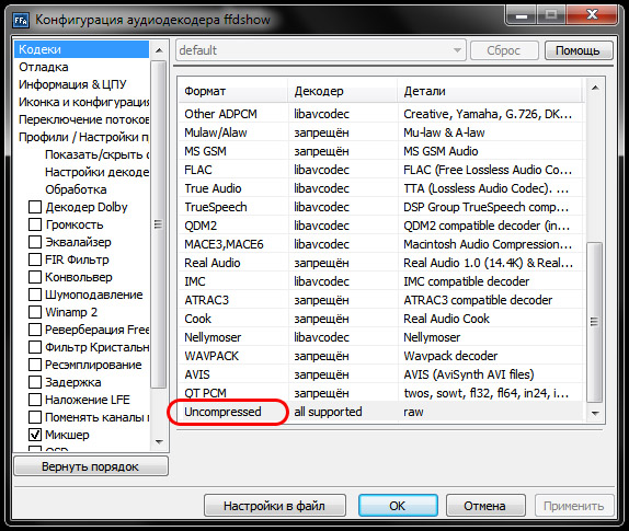 ![]() Запускаю Codec Tweak Tool 5.7.8, далее кнопка DirectShow Filters, ffdshow audio decoder (x86), микшер. Подскажи, плиз, где это меню искать? Открывал все меню - нету "Uncompressed" нигде.