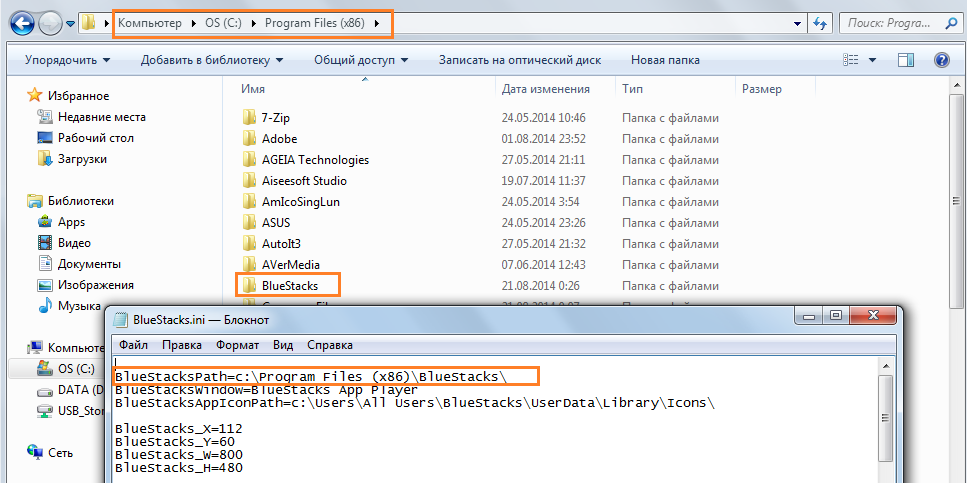 Соответствие папок BlueStacks и Windows 7: