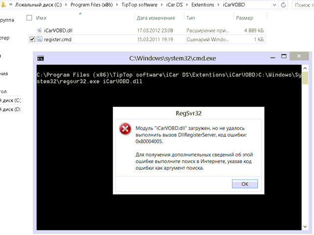 У меня тоже в Windows 10 x64 выскакивает такая ошибка при регистрации register.cmd и при этом не работает не инфа панель не круглые датчика, информацию выводит только окно OBDmain, плагин в iCarDS стоит iCarVOBD&OBDMain
