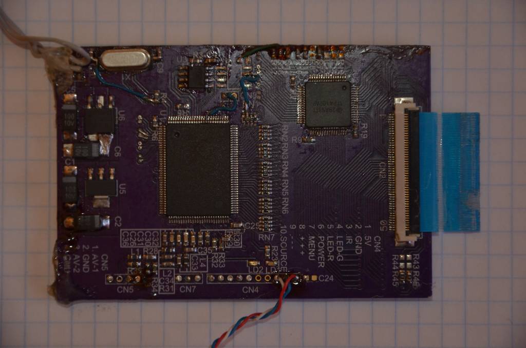 Схему в ПДФ формате выложил ниже. По поводу того, что параллельный 50-пиновый TTL интерфейс это только TN-film, не соглашусь. Вот матрица с данным интерфейсом, но она IPS. Конечно мне пришлось ее еще поискать, но я об этом не жалею, т.к. реально нет ни какой инверсии цветов под любыми углами обзора. В данный момент именно эту матрицу я установил в свой проект. Да и с прошивками не было ни каких проблем. Сначала я купил этот контроллер и китаец мне прислал его уже прошитый под мою матрицу, но т.к. меня не устроило время переключения на AV, то я попросил ancc сварганить прошивку под мою матрицу и он тоже это сделал.