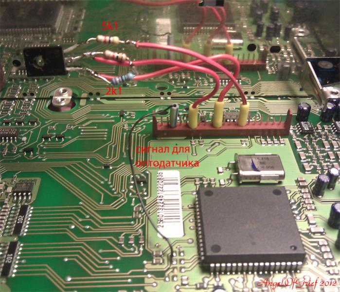Имеется вот магнитолка BE2580. В ней радио, кассетник, внешний чейнджер на 6 дисков (без поддержки Mp3) и внешняя навигация с СD-ROM (не работает, т.к. диск утерян). Все это хозяйство установлено на Porsche 911 Turbo 2002 года. Озадачился следующим проектом: хочу снять лентопротяжку, вместо нее установить тел. на Андроиде, от него подключить звук, видео подать на дисплей мафона (у него есть вход RGB для навигации, хотя пока не ясно как его активировать при нерабочей навигации). Такчсрин аппарата надо будет переставить на экран мафона - чтобы все работало по-человечески. Переставить полностью тел на дисплей нельзя, т.к. нужно оставить родные функции машины, а также предусмотреть подключение парк. камеры (которая в стоке на этой модели Порша не бывает). Задача оставить родную магнитолу ставится потому, что хочется сохранить фирменный дух Порша, а также не вызвать на себя гнев Поршевского коммьюнити установкой китайского левака. ![]() Пока была поставлена простая задача: снять лентотяг и сделать вместо него AUX-IN, которая на поверку оказалась непростой: мафон напрочь отказывался работать в режиме кассеты при отсутствии лентопротяжки и переходил в режим радио. Обыскал весь инет, но понял, что никто эту задачу не решил: все оставляют лентотяг в режиме "вставленной кассеты" и просто подают сигнал на вход звукового DSP, при этом мотор крутится. Подумал, добью. К тому же, надо освободить место для тела. Стал разбираться, выяснил, там есть оптодатчики вращения катушек, а также (самое сложное) датчик положения, выполненный при помощи энкодера (т.е. от положения головоки, кассеты итд итп зависит сопротивление, принимает 4 значения: 20к, 7к, 2к, 0к). Далее, опытным путем установил, что достаточно 2к и 0к. Когда включается кассета, надо чтобы было 2к, затем 0к. Коммутацию сделал при помощи выхода, которым управляется двигатель тонвала: он как раз включается когда кассета играет. Хотел использовать реле, потом подумал, что проще сделать на транзисторе. Под руки попался КТ815 (BD139), его туда и всунул. Когда транзистор закрыт (мотор тонвала выключен), имеем сопротивление "энкодера" 2к, когда транзистор открывается (мотор тонвала включен), сопротивление "энкодера" - 0к.Оптодатчик обмануть было проще всего: методом тыка нашел на плате источник импульсов примерно 40 Гц и его подключил туда (на схеме 18 контакт разъема лентопротяжки - ко 2 контакту SAA6579 -- это RDS-декодер, у нее на 2 контакте постоянные импульсы). Ради хохмы пробовал подключить датчик оборотов к шине адреса ПЗУшки, но мафон впадал в прострацию и я перестал его мучить. ![]() В общем, на всю эту бодягу ушло 2 дня, результат выкладываю, пользуйтесь на здоровье кому нужно! Обозначения на схеме совпадают с обозначениями на плате лентопротяжки (она стандартная во многих бекерах). Теперь буду искать как активировать RGB входы дисплея без активной навигации. p.s. Там на рисунке 3 резистора, это потому что у меня не было 2к и я соединил 2шт 1к последовательно. ![]() Последний раз редактировалось AngelOfGrief; 23.02.2012 в 00:54. |