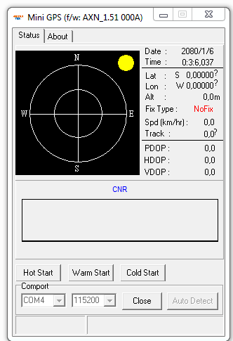 Перепробовал скорость порта в винде по-порядку выставлять начиная с 9600 до 115200, после выбора каждый раз вкл-выкл приёмник из USB, запуск MiniGPS, выбор соответствующей скорости порта, подключение. Результат не изменился...