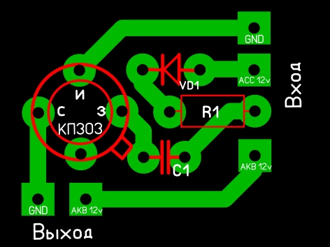 ACC через конденсатор (примерно 20мкФ) питает базу, сам ток аккума авто идет через коллектор-эмиттер на планшет/хаб и после пропадания питания конденсатор продолжает питать слаботочную базу транзистора некоторое время, зависит от ёмкости конденсатора. 20мкФ секунд на 5 должно хватить. Размер схемы заметно уменьшается. |