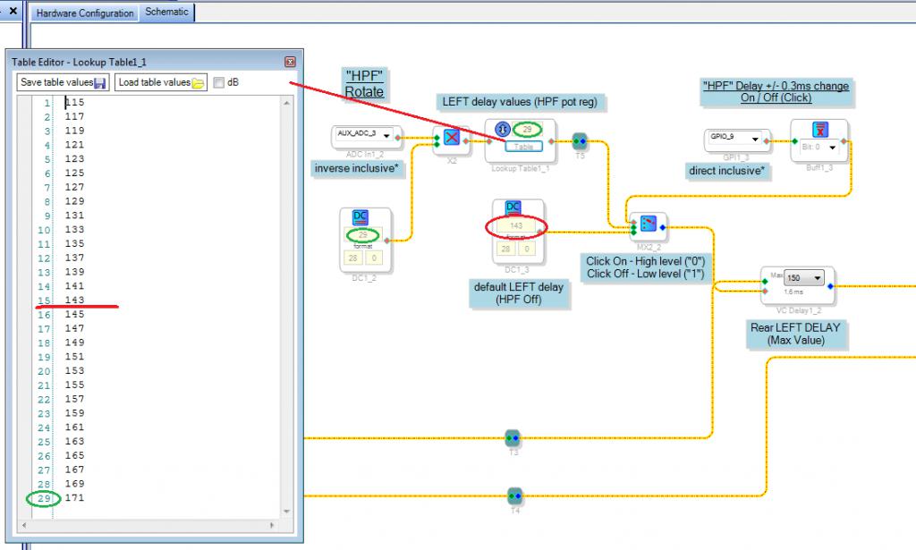 ![]() Переделал прошивку DSP X5 "под себя", пока не шью, т.к. плата еще не установлена (были заморочки с поиском необходимых коннекторов и т.д.). Прошу оценить правильность такого варианта реализации задержек. Хотелось, чтобы задержки при выключенных регуляторах LPF/HPF были статическими - заранее установленными, исходя из замеров рулеткой. А для возможности регулировки, как в минус, так и в плюс от установленного значения, можно было бы включить потенциометры (за клик) и крутить хотя бы +/- 0,3мс (больше - вредно, т.к. страдает точность) с расположением замеренного значения ровно посередине диапазона регулировки. Вопросы, которые мучают: 1. правильность выбора значения DC (29) для выбора значений по таблице (29 строк). 2. возможность использования мультиплексора (MX) как переключателя для выбора между линиями контролов, а не звукового сигнала. 3. инверсность потенциометра - как она скажется на результате?