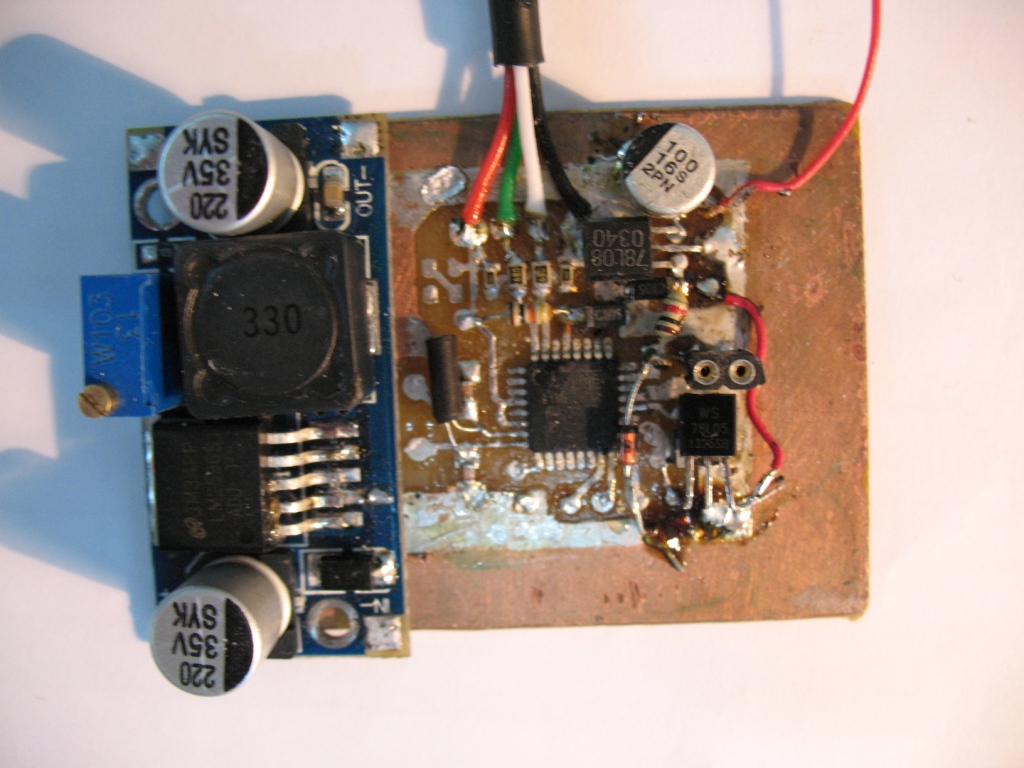 Две емкости под 78L05 их не видно, одна на ADC ref вторая на питании, эта плата отладочная, в машине вторая редакция на ней добавлен ключ на полевике для перевода планшета в хост и обвязка для выключения зарядки. В последней редакции все запитано: от бортовой сети - зарядка на LM2569, от АСС -78L08 потом 1к и стаб 5.1В на ноге АЦП в таком варианте не плавает напряжение на кнопках при включенном выключенном двигле и при просадке при заводке, после 78L08 питание 78L05 на АТМегу. Пробовал питать от планшета но там по мере зарядки меняется напряжение 4.92-5.1В для кнопок великоват разброс. Такой вариант мне показался более стабильным...
