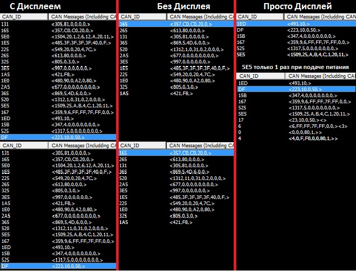 Оказалось что в машине List of station который передаётся мультифреймом не такой как дома. Он всегда состоит из одной строки отображающийся на дисплее. Короче стало очевидно что магнитола определяет тип дисплея который подключён или может он прописывается диагностической программой при установке? Есть у кого какие мысли? На всякий приложу картинку с ID которые у меня есть на столе в связке магнитола и нормальный дисплей. Там нескольких нет, но они возникают после некоторого время работы, так что не относятся точно к иниту дисплея если он есть. |