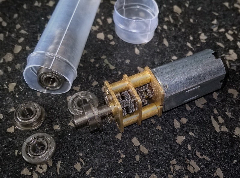 Практически бесшумный. При питании от 5 вольт скорость примерно 6-7 оборотов в минуту и ток при нагрузке в 2 кг./см. - 18-20 мА. Заявленное усилие на валу - 3 кг./см.(похоже на правду). Габариты 12 мм. Х 10 мм. Х 40 мм. Диаметр вала - 3 мм. Ну и до кучи прикупил подшипники... Буду пытаться сделать "управляемую" крышку для корпуса механизма.