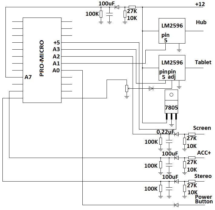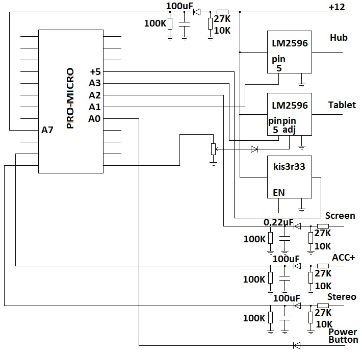 Резисторы- входной делитель 20к и 10к на землю, после диода 100к на землю. Конденсаторы- на подсветку 0,22uF, а остальные по 100uF. Диоды любые. Резистор подстройки напряжения на БП для планшета это выпаянный резистор со второй платы БП. на схеме нарисована промикра если это кому принципиально. Просто потому что она у меня была и лутчшего применения ей не нашлось. SPI и I2C хвосты свободны, так что можете подключать хоть индикаторы, хоть датчики какие либо ещё. Мне просто всё это украшательство вообще не нужно- всё это будет за планшетом в панеле и видно этого не будет, только лишнюю напругу жрать будет. А как идея- подключить датчик температуры, какой нить DHT11 скажем, и при превышениях температуры врубать вентилятор охлаждения планшета... Я свой ещё в боевых условиях не тестил, так что не знаю будет что с ним не так или нет. |