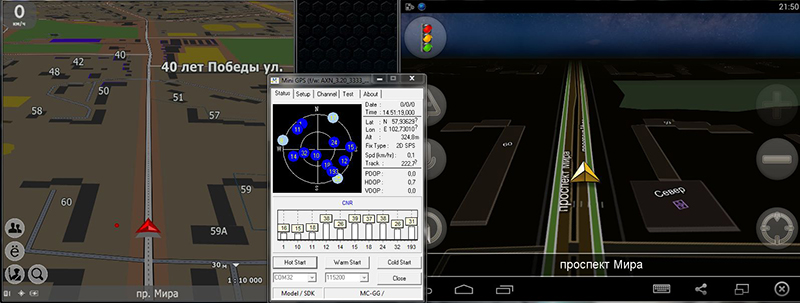 Работа Locosys LS-23030-G (GPS+ГЛОНАСС) в Сити Гид и Яндекс навигаторе.