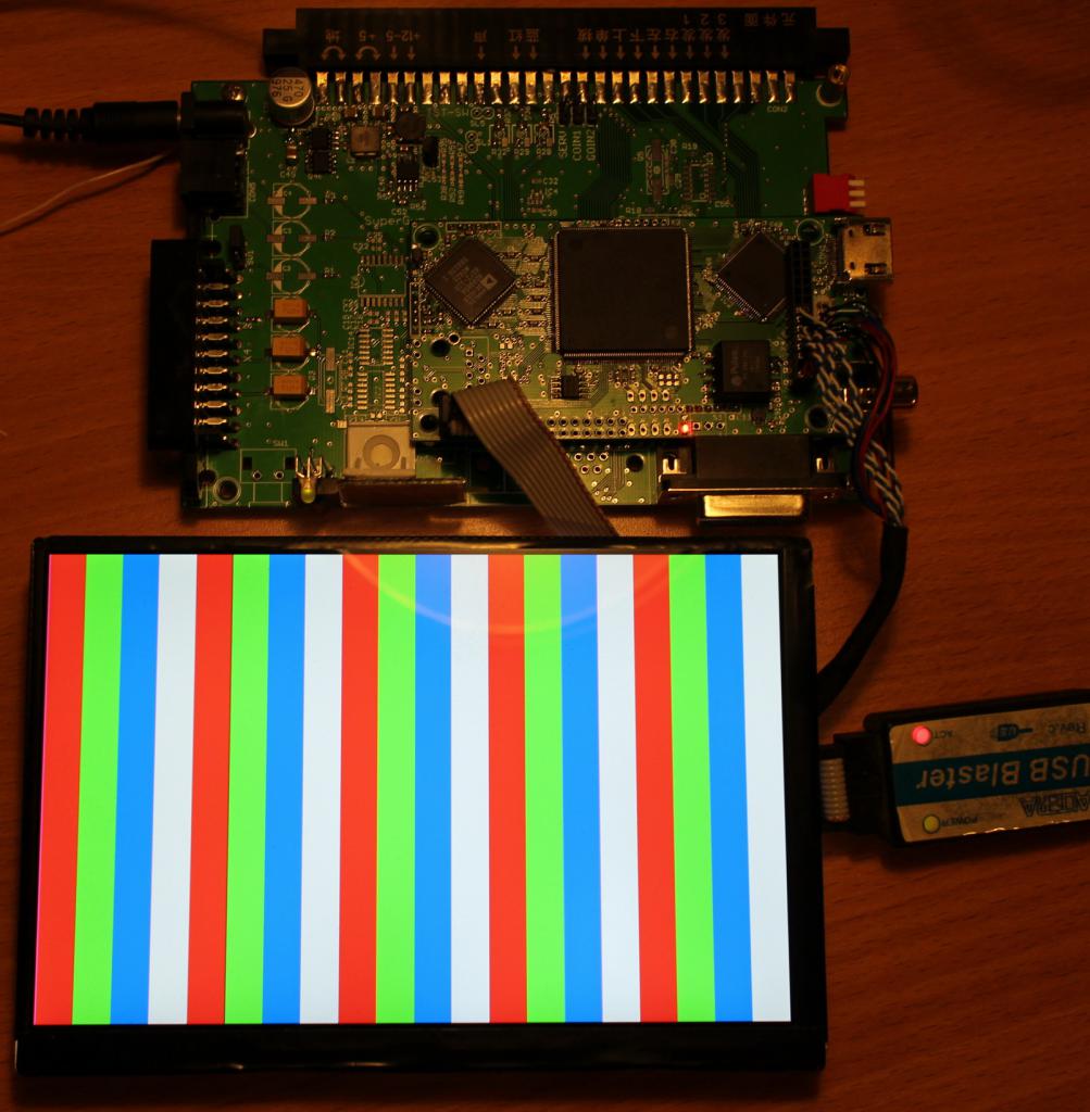 Есть вопрос по сабжу. Заранее извиняюсь если на него уже отвечали (все 96 страниц топика не читал). Итак, имеется матрица Innolux N070ICG-LD1 с контроллером на Реалтеке с Алиэкспресса. Брал для использования с Raspberry Pi, да и для своих электронных поделок. Понадобилось тут подключить ее в качестве дисплея по LVDS к FPGA. Почитал доки на матрицу: 4 дата-канала (16млн.цветов) плюс канал клока. Развел плату, собрал, настроил конфигурацию FPGA. Как ни странно картинка с тестовыми полосками появилась сразу, цвета яркие, сочные (см.фото), но лишь потом заметил, что LVDS кабель из комплекта содержит всего 4 витых пары (клок и 3 дата-канала). Отсутствует канал RxIN3, который содержит по 2 старших бита всех трех основных цветов: B7-6, G7-6, R7-6. Если матрица соответствует докам, то получается что старшие биты просто не доходят до матрицы и она работает в нижней (темной) четверти всего диапазона цветов. Тогда и контроллер на реалтеке должен знать о таком "кривом" подключении и делить значение каждого цвета на 4 чтобы обнулить старшие биты. Т.е. картинка выходит в 4 раза темнее чем должна. Либо матрица адаптирована под подключение по LVDS 3+1 (что по мне так нетривиальная задача), работает по шестибитной схем и тогда доки на матрицу некорректные. Чтобы выяснить правду надо бы потестировать матрицу с нормальным кабелем на 4+1 LVDS, но у меня нет такого, а допаивать витую пару на коннектор с шагом 0.3мм весьма непросто... Для меня это не вариант... Сейчас сижу, чешу репу - стоит ли разыскивать полный LVDS кабель под эту матрицу (не факт что есть такой)... |