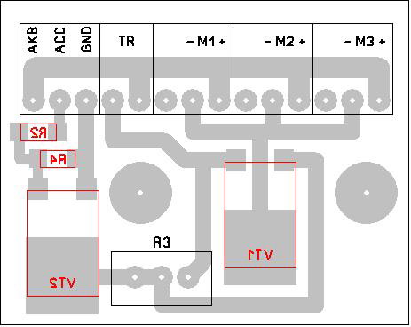 При отсутствии +12в на входе АСС - все выключено (ток потребления 0), при наличии +12в - следим за температурой на датчике и рулим вентиляторами. Подстроечником устанавливается порог включения вентилятора. Настраивается достаточно гибко. Сейчас настроено так: запускается вентилятор при температуре на датчике 40 градусов (датчик установлен сантиметрах в 12 от микросхем, т.е. на датчике 40, на микросхемах уже под 50), вращается несильно. С ростом температуры скорость вращения увеличивается. Максимальная скорость достигается где-то на 60 градусах. По мере остывания обороты падают, при 38 вентилятор останавливается. Запас регулировки, как в плюс, так и в минус - достаточный. Подстроечник в собранном усилителе будет легко доступен. |