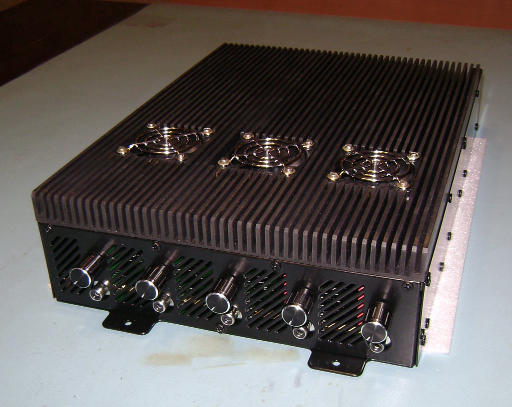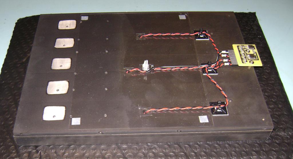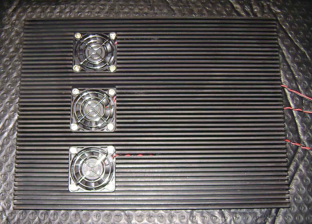 Места установки микросхем зачищены от чернения и отшлифованы "нулевкой". Чтобы не ободрать лишнего - перед зачисткой все вокруг (с небольшим запасом) заклеивается малярным скотчем. Некоторые детали на основных платах находятся в опасной близости к краю (к радиатору). И хотя нигде ничего радиатора не касается, зазоры местами очень маленькие. Кроме того от некоторых "полигонов" до края платы всего 0.32мм. Чтобы кабы чего не вышло, на всякий случай, на радиатор под платы положена пленка от ламинатора, толщиной примерно 0.3мм. По фактуре она - как защитная пленка для экранов. Закреплена на двусторонний скотч - белые квадратики по углам. Сразу разводится проводка от вентиляторов и терморезистора. После установки плат - провода пройдут под стойками. |