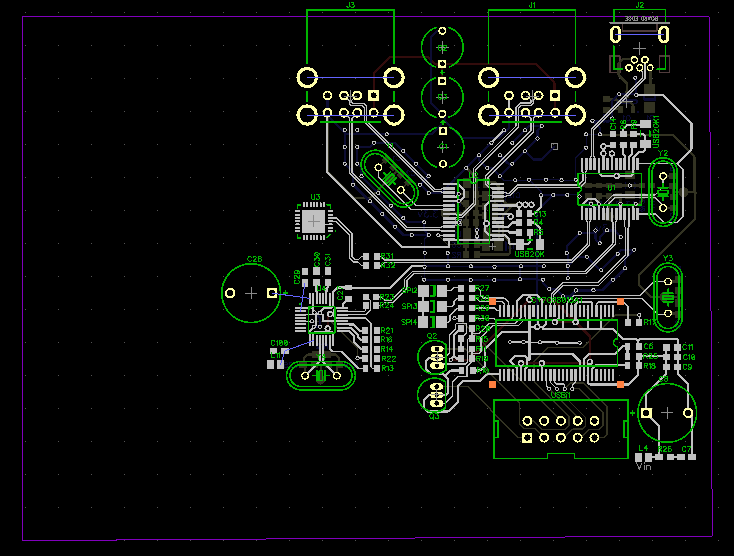 1) Развел USB HUB на GL852G 2) USB звук на PCM2706 для вывода I2S звукового сигнала 3) И программатор USBi на CY7C68013A1 для связи с DSP процессором ADAU1452 программой SigmaStudio Плата 4-х слойная. Вся земля и питание внутри. |