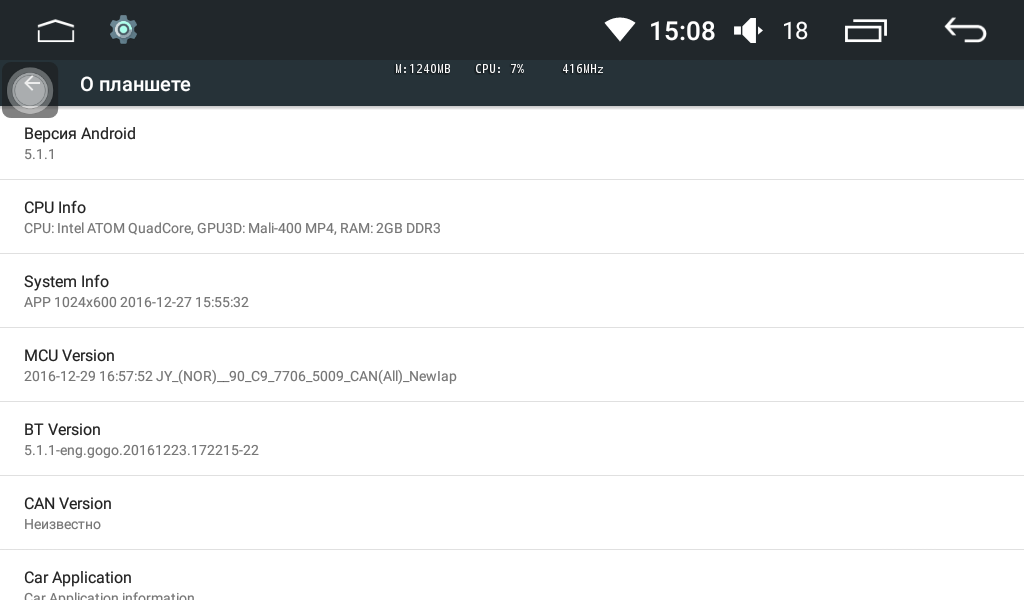 Как и всегда картинки снаружи можно посмотреть тут. Магнитола от JOYING на RK3188 тут. Тема на 4PDA. Тема на XDA. Обновления от производителя. Внутренности: Маркировка на модуле процессора 2G-32G - 2GB ОЗУ и 32GB флэша Обратная сторона модуля процессора, все интегрировано на ней: USB 2.0 4-х портовый хаб FE1.1s, мультиформатный цифровой видео декодер ADV7181D, аудио процессор BD37033FV Дисплей известной марки и с хорошей яркостью. Плата универсальная, она-же подходит и для 10.1" Усилитель мощности конечно же китайский TDA7388 Магнитола имеет две настройки работы при подаче-снятии АСС: - полное выключение - режим сна В режиме полного выключения после отключения АСС через ~40 сек магнитола выключается, ток потребления от BAT при этом ~1.5mA. При подаче АСС время загрузки ~36 секунд. В режиме сна после отключения АСС через ~60 сек магнитола переходит в режим сна, ток потребления от BAT при этом ~11mA. При подаче АСС время пробуждения ~1 секунды. Из 32GB памяти всего места 26GB, доступно ~22GB. После загрузки ОЗУ свободно ~1.36GB Ссылки на описание некоторых настроек (будут дополняться): Управление подсветкой сенсорных кнопок и алгоритмы их работы
