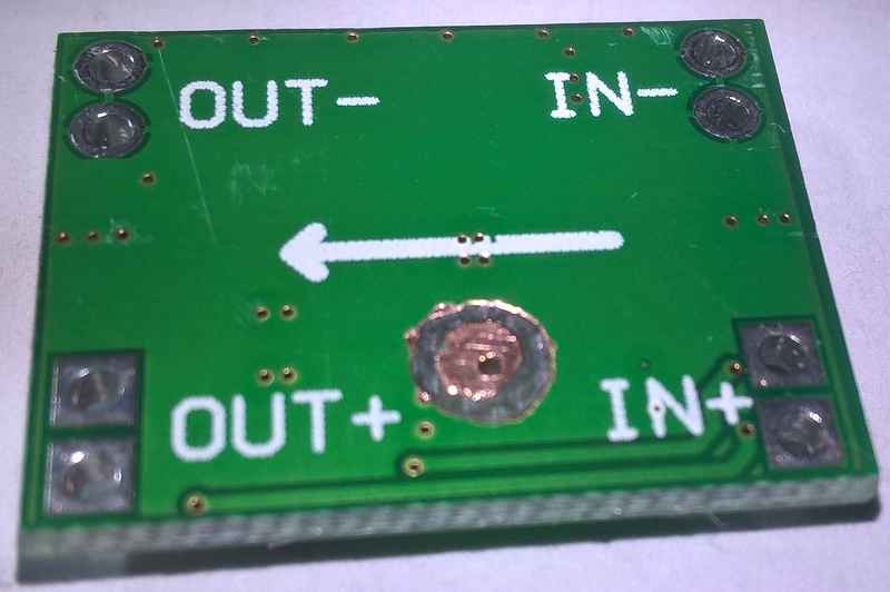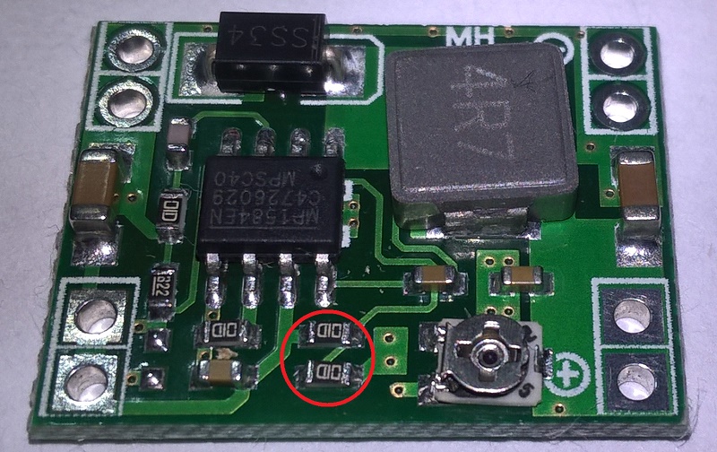 Многие в своих работах используют DC-DC преобразователь на микросхеме MP1584. Я не исключение... Для моих поделок он подходит, как нельзя лучше - маленький (помещается в корпуса миниатюрных сервомоторов для отдельного питания), достаточно мощный - нагрузка до 1,5 А без радиатора. Использую и для питания контроллеров, и для питания обвязки управления ... Очень экономичный - в режиме покоя потребление всего 20 μA (микроампер!)- это возможно, если использовать управляющий вход (нога №2) на микросхеме MP1584. По даташиту, если ногу притянуть к "земле", то микросхема переходит в ждущий режим, если на ногу подать напряжение в пределах от 1,6V до 3,0V- микросхема включится. На готовой плате он не выведен и хочу поделиться, как это делаю я. Модуль очень маленький и подпаяться прямо на плате достаточно сложно (возможно, но провода торчащие из платы в моем случае допустимы, если модуль "прячу" в корпус сервы ). Итак: сдуваем с платы два резистора. Затем сверлом 0.8мм сверлим отверстие вот здесь. Оно должно быть как можно плотнее прижато к контактной площадке отпаянного резистора, но не заходить на неё. Далее с обратной стороны в поле GND вокруг просверленного отверстия формируем контактную плошадку (я использую гравер). Счищаем слой маски для пайки. Если гравера нет, то можно зенкануть отверстие (сделать небольшую лунку на половину толщины платы) простым сверлом диаметром 3.5-4.5 мм. Далее в отверстие вставляем штырь от гребенки PLS и аккуратно припаиваем со стороны деталей к контактной площадке. Можно паяльником с жалом "игла"(флюса побольше и немного припоя-использую нейтральный флюс ЛТИ120). Или термофеном от паяльной станции с паяльной пастой. С обратной стороны, если сделана площадка под пайку тоже припаиваем. Если площадки нет, а есть лунка, то ее надо залить эпоксидкой (процесс немного затянется...). Все эти манипуляции для более жесткой фиксации штыря в плате ( площадка от резистора абсолютно не надежная ).
