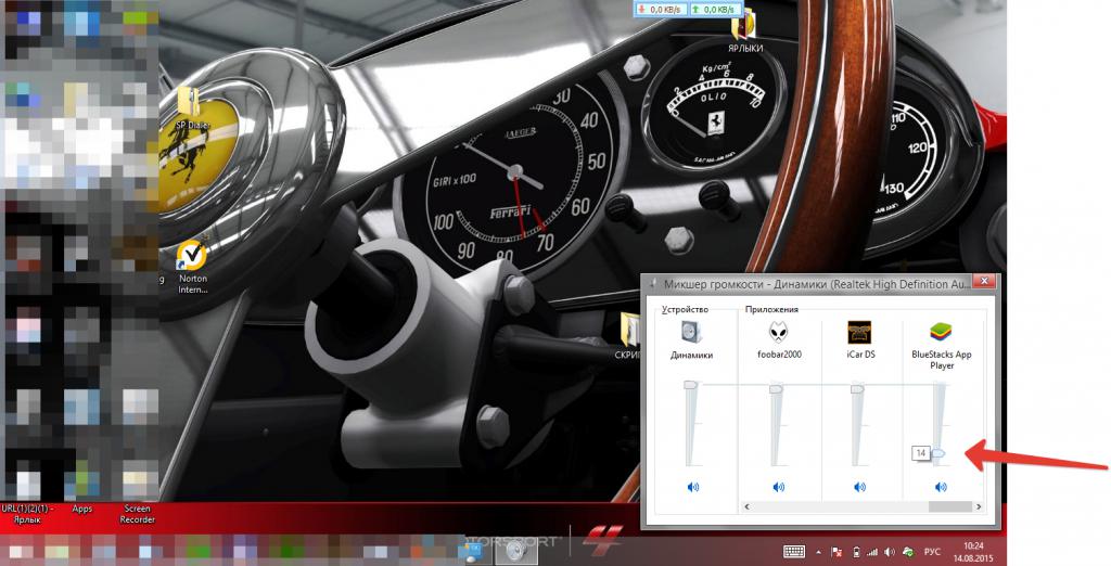 1. Запускаем блюстак. 2. В икаре, с помощью кнопок громкости, выбираем значения громкости и запоминаем цифру, например 14 %.. 3. Сворачиваем Икар, идем сюда: ползунок перемещаем, ищем Bluestacks App Player и опускаем ползунок на выбранные ранее в икаре значение (14%) ... поднимаю вопрос