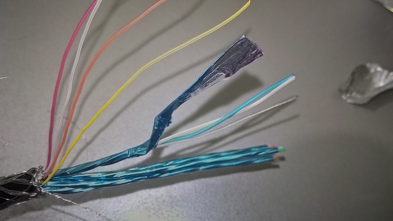 В каждой отдельной "витой паре" должно быть три провода."Пары" могут быть разноцветными, но один из них одинакового цвета во всех "парах" или вовсе без изоляции -это экран каждой конкретной "пары". Его также припаивать на корпус USB разъемов.