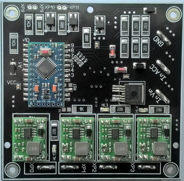 Функционал распределителя не изменился. Немного уменьшился размер ( теперь 94 мм х 93 мм), удалил стабилизатор питания включения смарт-ключа, что позволило расширить  диапазон входного напряжения до 32.0В (да и в "спящем" режиме LM-ка все-таки тоже потребляла mA...), добавил отдельный контакт-терминал "GND". Изменился супервизор, отвечающий за отслеживание напряжения "севшего" аккумулятора (ручная подстройка напряжения отслеживания осталась от прежней версии и лежит в границах от 10.0В до 12.5В) - теперь ток потребления супервизора 1.75 μA (max.).