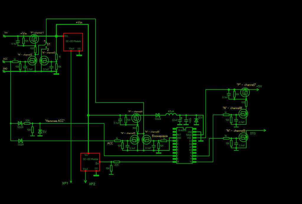 Вот примерный алгоритм согласно схемы, которую я тебе высылал (ниже в приложении). С отслеживанием напряжения просто нужно дописать "отключение по событию". Запуск двигателя Блок питания выключен. Проворачиваем ключ в замке зажигания в положении АСС 1) Подаётся +5в на вход D7. (наличие «АСС»), Через ключ «channel 2 и channel 1» подается питание на основной DC-DC, через ключ «channel 5 и channel 4» подается питание на контроллер от основного DC-DC, включается канал на D2 «блокировка» и через ключ «channel 6» блокирует ключ «channel 4» (теперь когда пропадет «АСС» система сразу не отключится, а будет выключаться по заданному алгоритму) и блокирует ключ «channel 1» (если выключатель S1 в положении 1, то после отработки алгоритма выключения система полностью обесточится, если в положении 2 , то питание всегда подается на основной DC-DC, при этом контроллер всегда запитан ), «нажимаем кнопку» запуска материнской платы. 2) После включения мат.платы на D4 подаем с материнки +5В (наличие включения мат.платы.) Проворачиваем ключ в режим запуска стартера: 1)Сигнал АСС пропадает, но так как все блокировки через ключи работают и есть задержка на выключение в 5-7 секунд система продолжает работать. 2) Двигатель запускается, на вход D7 вновь поступает питание +5в (наличие «АСС»). 3) Двигатель автомобиля запущен, блок питания включен, компьютер работает. 4) Отслеживание напряжения на А0. Глушим двигатель. Пропадает «АСС»: 1) На вход D7 прекращает поступать питание +5в (наличие «АСС»), но так как все блокировки через ключи работают и есть задержка на выключение в 5-7 секунд система продолжает работать. 2) Через 5 — 7 сек «нажимаем кнопку» выключения на материнке 3) После того как материнка выключилась пропадает +5В на D4. 4)через 1 секунду выключается канал D2 «блокировка», выключаются все ключи и система полностью обесточивается !«нажимаем кнопку» выключения на материнке — канал на контроллере по выбору. Последний раз редактировалось skanch; 06.10.2017 в 22:28. |