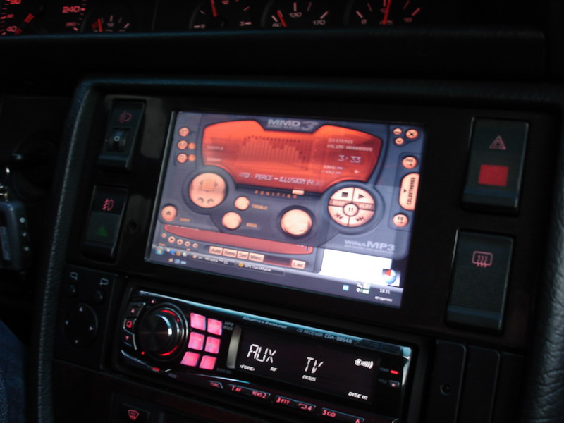 , с каждым я проездил около полугода.Итак первый. монитор Prology PCM700 проц Celeron 2.66 системная плата ASUS I865 VIDEO DIMM DDR 512 HDD 2.5 60Gb DVD-ROM Creative X-Mod GPS GlobalSat 355 Wlan D-link Bluetueth Тв тюнер внешний COMPRO пульт универсальный logitech блок питания 300W адаптер 12В-220В Корпус я делал из фанеры, в принципе получилось весьма неплохо для первого раза, было несколько минусов. Во первых неудачная система питания через преобразователь и через обычный бп, при попытке завести машину комп просто выключался, да много места занимал, хотя в багажнике было достаточно место в нише и он ничему не мешал. Рамку в торпеду пилил из текстолита, lолго мучительно, но получилось хорошо. |