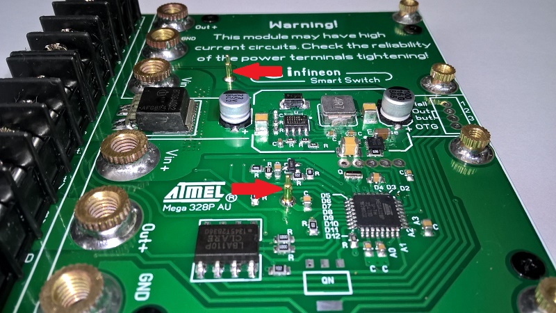Блок питания построен по модульному принципу: на основной плате располагается контроллер управления Mega328P в корпусе AU, блок питания самого контроллера на DC-DC преобразователе MP1584 и силовые ключи, а DC-DC преобразователи сделаны в виде отдельных модулей. На плате располагаются два модуля, максимальный коммутируемый ток которых при выходном напряжении +/-5V может составлять до 10А (зависит от варианта исполнения модуля). Так же есть отдельный силовой канал с коммутируемым напряжением, как на АКБ автомобиля и током нагрузки до 8А, к которому можно подключать выносной DC-DC модуль. В общей сложности получается три мощных управляемых канала. Все выходные каналы на контроллере сделаны через smart-ключи компании Infineon. Входное напряжение коммутирует BTS640S2, такой же ключ отвечает за силовой выход выносного DC-DC модуля. Вспомогательные коммутационные действия выполняются через smart-ключи BSP452 и BSP78. Все ключи имеют полный набор защит: защита от короткого замыкания, от смены полярности, защита входа управления, защита от перегрева с гистерезисом, от перегрузки, от перенапряжения, отключение по минимальному напряжению и по максимальному току, защита от электростатики (ESD ).