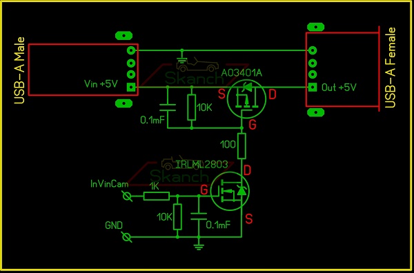 И кабель разделывать по такой схеме. От 4-го контакта на micro USB планшета (этот вывод можно и к пятаку паять) выводите наружу из планшета провод управления OTG режимом. После включения планшета и его полной загрузки с небольшой задержкой в несколько секунд нужно этот провод замыкать на "массу". Для адекватной работы EasyCap нужно коммутировать его собственное питание. Перевели селектор в положение "ЗХ", включилась камера и одновременно появилось напряжение +5В на EasyCap. Желательно для этого использовать твёрдотельное реле или сделать по такой схеме Тогда всё будет работать... По схеме выше сделан такой переходник - коммутатор напряжения для EasyCap. Последний раз редактировалось skanch; 08.06.2019 в 10:55. |