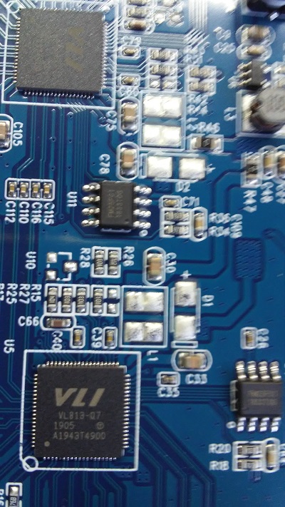 Вчера в ходе экспериментов с хабом сгорел мосфет на блоке питания который подает питание на +5в на хаб извиняюсь за качество фото фотал микроскопом пробовал соткой не получилось.Все микросхемы парные FM25F01=2,AX3121=2,VL-813=2.В ходе экспериментов выяснилось ,что хаб работает когда ему подаёшь и 12в и 5в получается на него и в него .