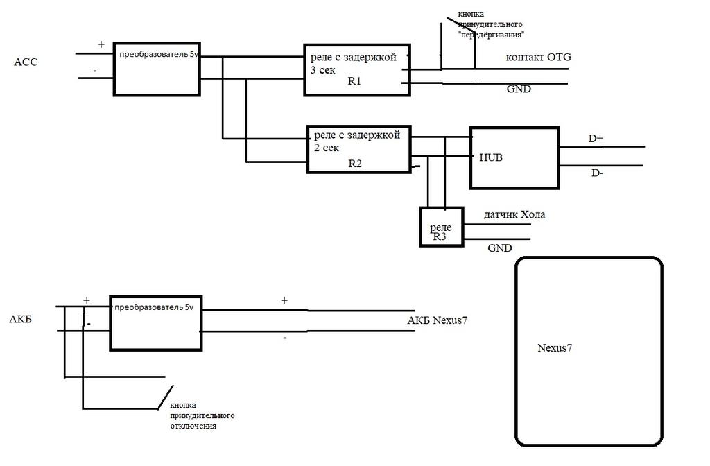 Всем привет! Долго читал тему, в принципе есть много схем подключений и достаточно подробно описаны. В общем набросал такую схемку и прошу посмотреть имеет ли смысл её реализовать? С прошивкой пока не определился, но склоняюсь к стоку т.к. включение будет по датчику Холла. До этого собирал без реле, напрямую, без прерывания контакта + на HUB и передёргивания OTG но иногда происходили спонтанные перезагрузки, переинициализация устройств и т.п.