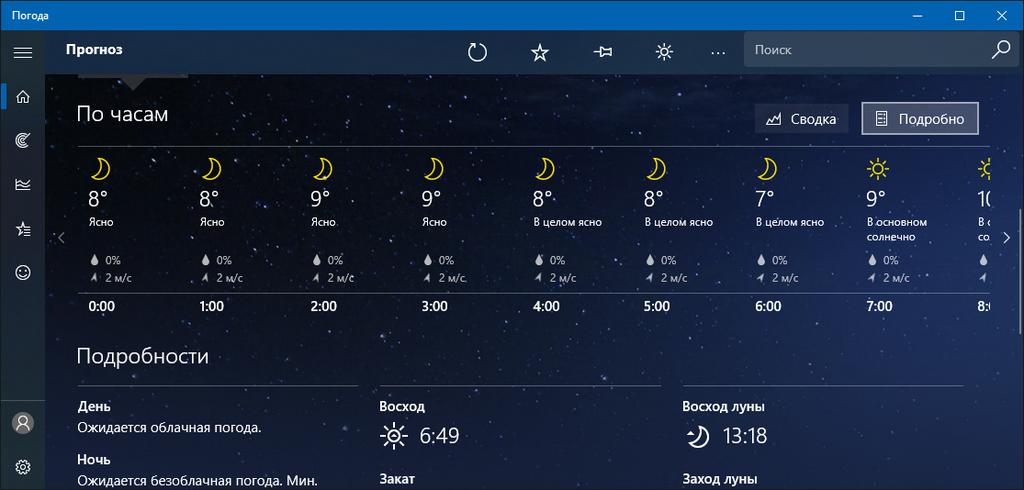 "Погода" от MS симпатичная, отображается нормально, прогноз на 9 дней, в т.ч. и почасовой, графики есть. Есть темная и светлая темы. Есть прошлогодняя погода, фазы луны, УФ-индекс, рекорды осадков и температуры, в общем, all inclusive. Вертикальная полоса прокрутки узковата, не знаю, удобно тачскрином двигать будет или нет, тестировал дома, т.к. в машине Win7. Все мелковато, не знаю, как в авто будет смотреться...