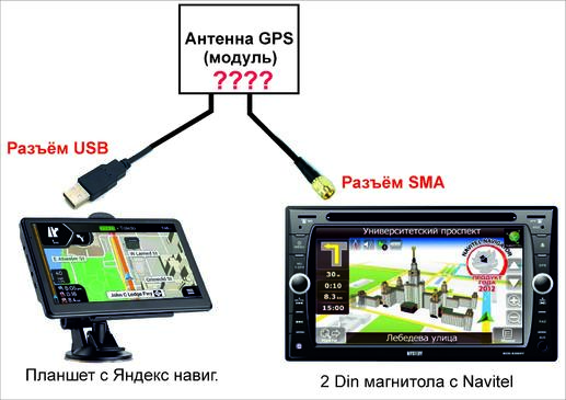 Какую антенну (модуль ) GPS применить, что бы она была подключена одновременного к навигатору (через разъём USB), и к автомагнитоле (через разъём SMA) ?? Дело в том, что не хочется использовать две самостоятельные антенны. На рисунке должен быть понятен мой вопрос.