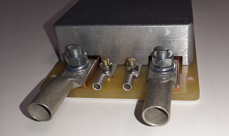 Ниже один из предварительных вариантов предохранителя. Габариты: длина 170 мм., ширина 90 мм., высота 60 мм.. P.S. Был собран прототип, протестирован на "столе" под нагрузкой 80А (больше мне не "нагрузить" в домашних условиях) при напряжении на входе 14,5V. При такой нагрузке падение напряжения на выходе относительно входа "предохранителя" составило 0,007 V (7mV). Прототип пока тестируется в более "жёстких" условиях у потенциального заказчика устройства. Детали тестов пока мне не озвучили, но знаю, что "нагружали" до 150А и общая оценка работы устройства положительная. В финишную версию добавлю мониторинг предельного напряжения на входе ( при напряжении 15,6V предохранитель будет отключаться или не включаться, с разрывом цепи). Последний раз редактировалось skanch; 27.10.2021 в 14:32. |