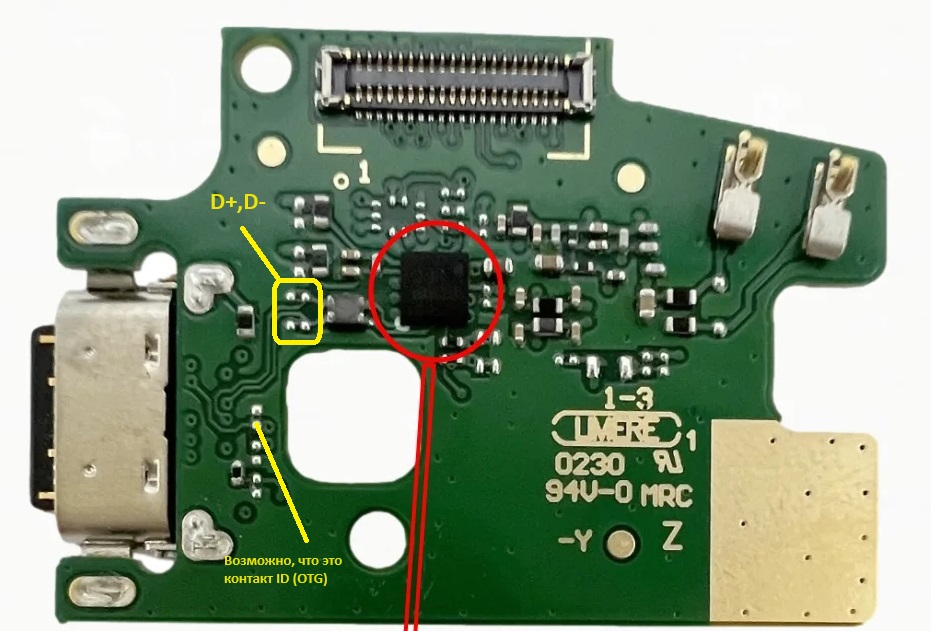 Картинка из интернета, поэтому на выделенное красным внимания обращать не нужно. Это, что бы было видно размер контактов от type-c. Причём в планшете эта плата зарядки лежит контактами вниз.