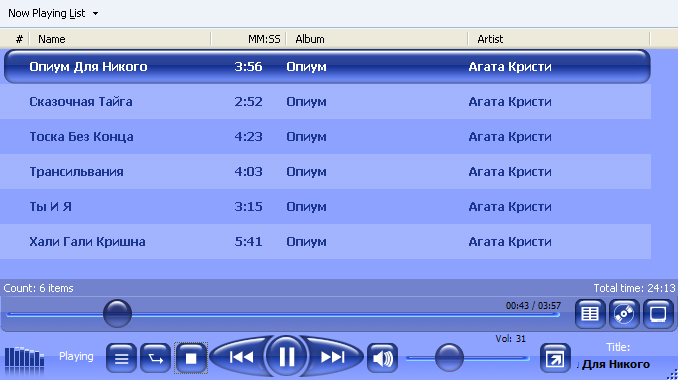 На этом скриншоте показан внешний вид переделанного плей-листа. Фон сделан зеброй для удобства. Высота изображения трека подобрана таким образом, чтобы можно было нажимать пальцем. Двойного щелчка не требуется, один клик - трек сменился. Для выделения треков можно щелкнуть справа от песен и произвести выделение "резиновой рамкой". Поскольку в дороге одним пальцем выделять треки неудобно, расстояние оставлено небольшое, для стилуса/мыши/ногтя.