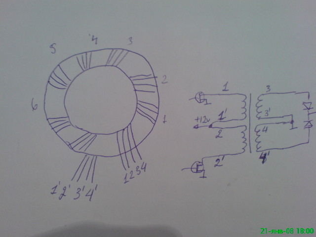 Рисунок выше не правильный (намотка правильная схема нет) Надо поменять местами на схеме 3 и 3`, 4 и 4`. |