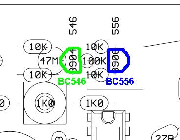 Синий и зеленый на фотке стоят правильно, а вот не помеченные 2 (С10(220мФ), С11(220мФ)) "+" на землю. С12-10мФ, С1-470мФ. Посмотри внимательно на фотке в посте №1. А вот с транзисторами действительно косяк, написано: SB556 и SB546, а надо BC556, BC546. | |