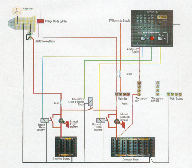 Причем от обсуждаемых схем (рис.1) – предлагают стандартную схему с диодными сплиттерами на рис.2. При этом получается независимая работа и зарядка обоих аккумуляторов.