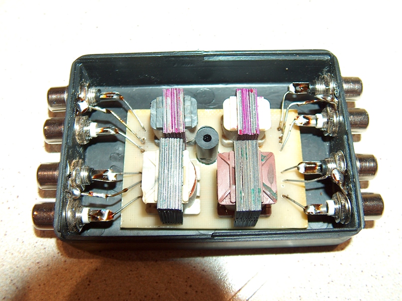 Шумы головок винта и особенно вой генератора пытался решить разными способами: подключение земли в разных точках корпуса машины, подключение толстыми до 6 кв. проводами в разных точках, даже на самой батарее - безтолку. Пока не сделал трансформаторную развязку по земле. были найдены четыре звуковых трансформатора из старых приемников типа КВАРЦ, и намотаны заново с обмотками 1:1 (мотались просто двойным проводом 0,1 мм, сопротивление обмотки получилось около 23 Ом). Я думаю, что для тех у кого нет Hi-End в машине это единственный и не самый плохой выход. Качество звука на слух не пострадала, но звук изменился, кажется стал лучше (поднялись низкие, звук стал более "упругим"). Конечно, если снять АЧХ, то она может быть очень не линейной, может и коэффициент искажений ни-ахти и развязка между каналами не очень, но на слух этого не слышно. Выкладываю фотки с готовым устройством. Ничего нового, оно есть и готовое, только в нашем колхозе этой штуки не было, а на заказ народ ломил немыслимые деньги (по 50$ за два канала, а у меня четыре). Трансы получились разные по габаритам, какие удалось достать, но главное намотка 1:1 и более менее одинаковое сопротивление обмоток. Сейчас никаких шумов, даже от винта. |